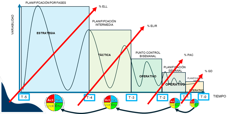 - Last Planner System® Mejorado con distintos niveles de detalle (plan maestro, plan de fase, lookahead, plan semanal,y aprendizaje), mejorando la confiabilidad del plan y reduciendo la variabilidad.